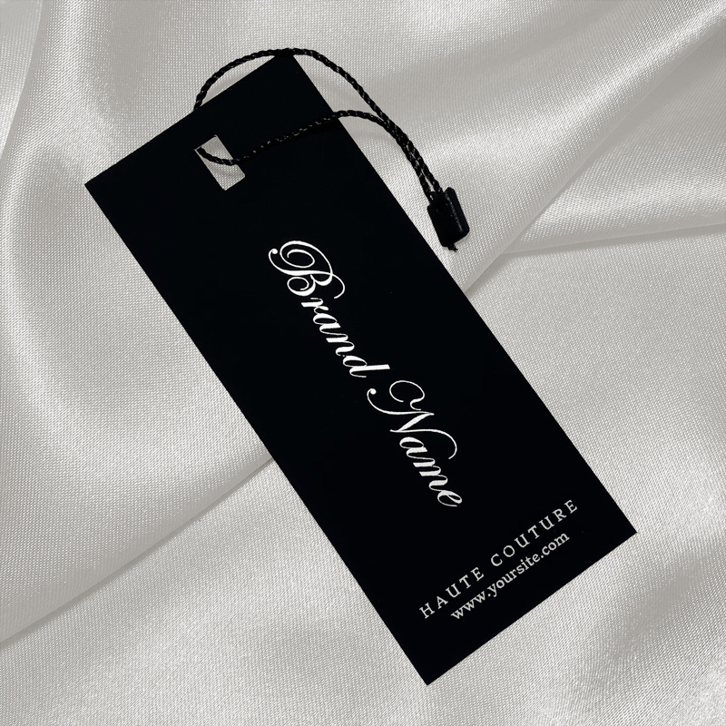 Cardboard label with plastic seal suitable for clothes and clothing accessories, made of thick black cardboard laminated with Soft Touch foil and personalized silver writing of Folio Hot Stamp type. This type of hang tag is made of high quality materials, using the most advanced technologies in the field of Digital print and finishing.
