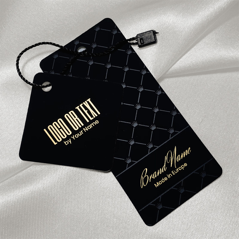 Premium quality clothing labels, provided with plastic seal with black string, made of Soft Touch laminated cardboard and personalized with gold foil. This type of hang tag is made of high quality materials, using the most advanced technologies in the field of Digital print and finishing.